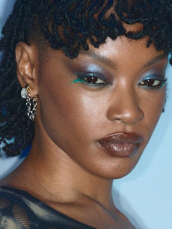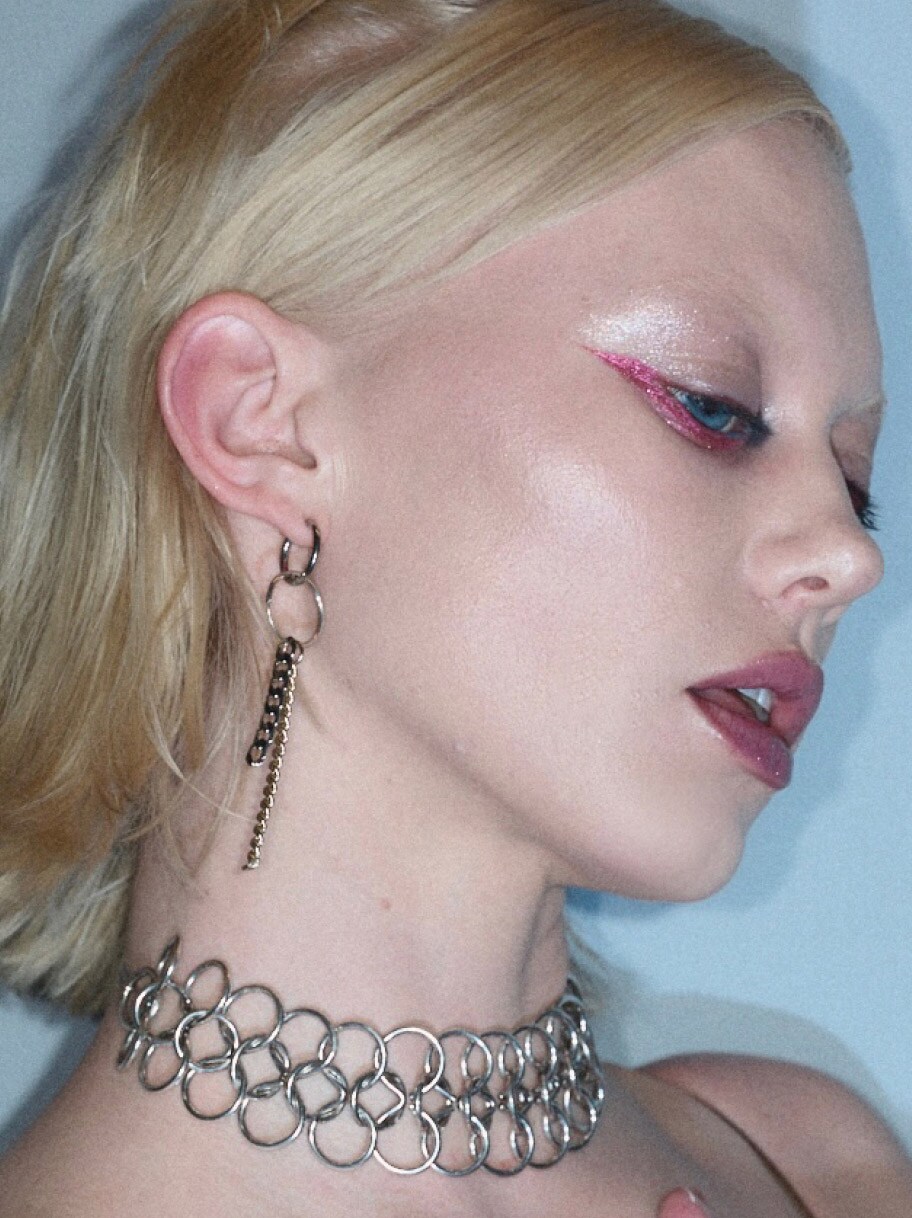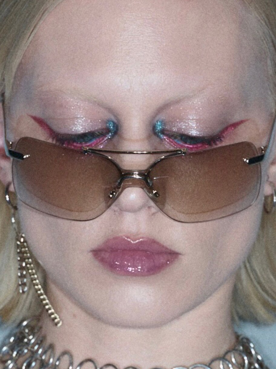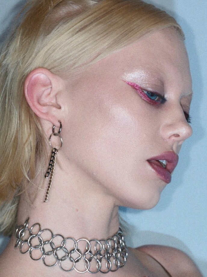 Con occhi cromati e labbra specchiate, questo look Y3K sprigiona una energia audace e fuori dal tempo.