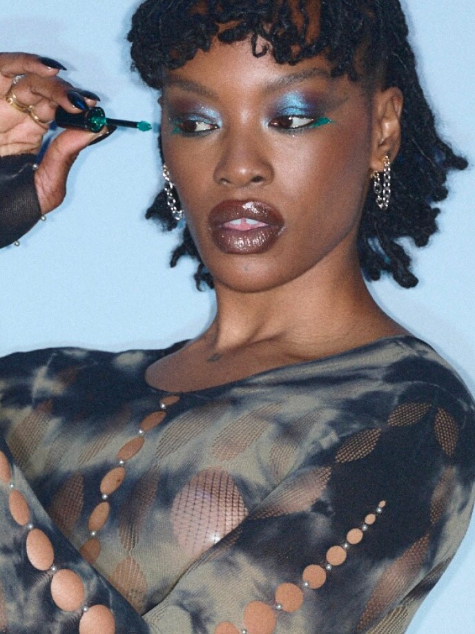 Shadeshift Chrome Eye Shadow e Dazzleshadow Liquid tracciano una nuova orbita: l’eyeliner scende sulla rima ciliare inferiore. “È stato un twist sull’eyeliner tradizionale. Invece di andare su, andiamo giù: super futuristico, super audace.” La combinazione di questi riflessi metallici quasi specchiati è l’essenza stessa del look Y3K: un’estetica che sorpassa tempo e gravità.